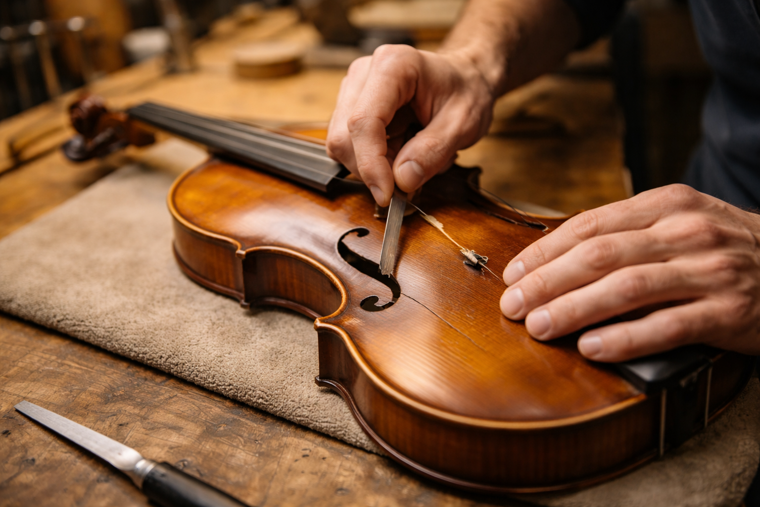 Cracks in high-stress areas are more serious. These include cracks near the soundpost, bass bar, neck joint, or saddle. Because these areas handle significant tension, repairs must be done correctly or the instrument can suffer further damage.